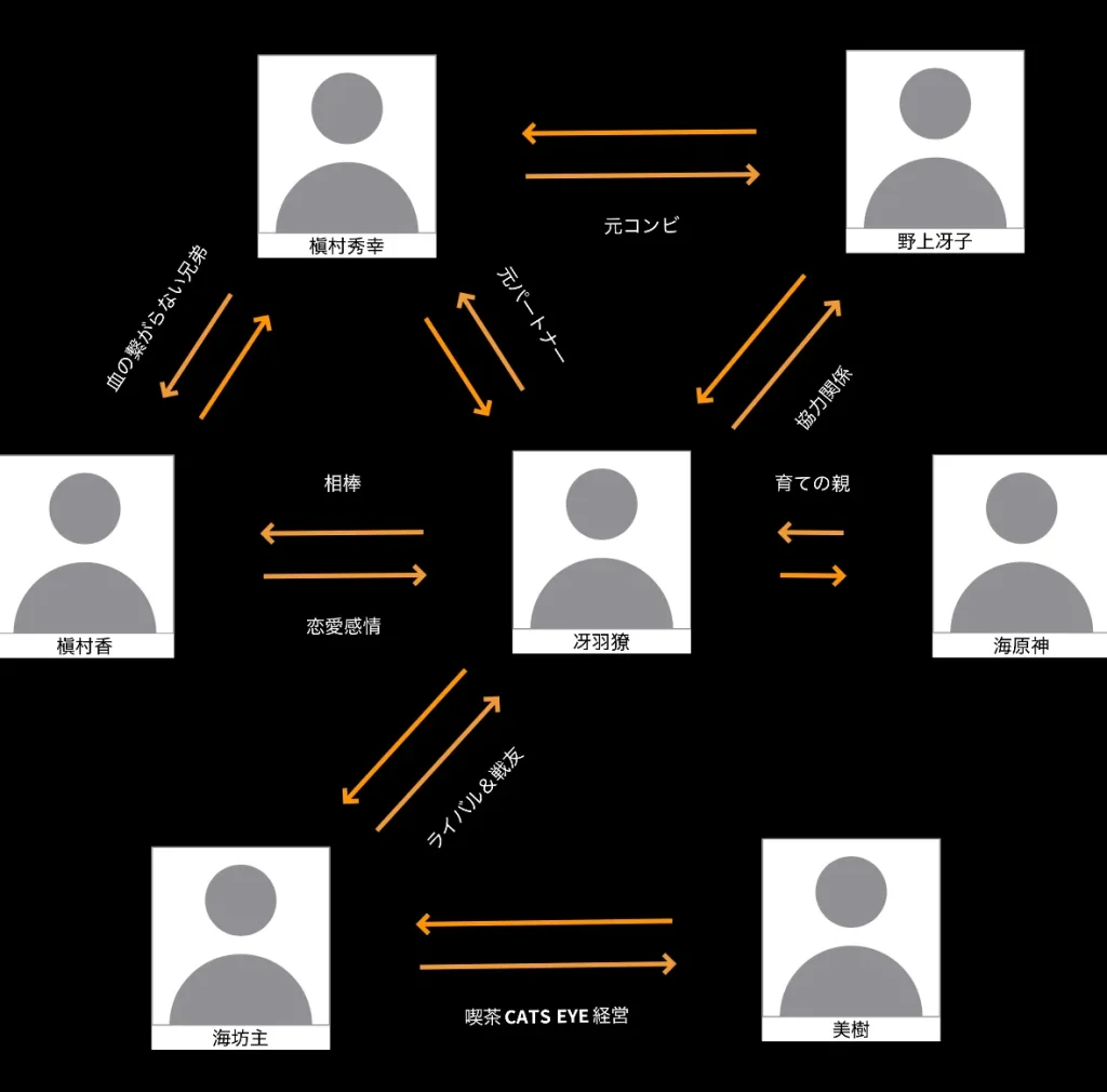 - 香⇄秀幸(兄):香が獠と行動を共にする理由となる、大きな存在。物語の中盤以降も精神的に重要な軸。